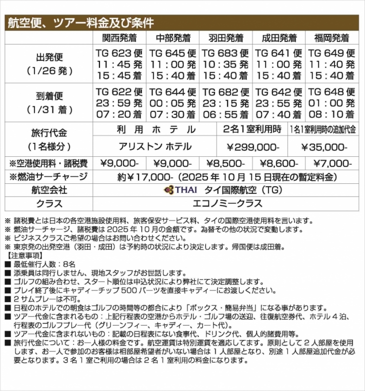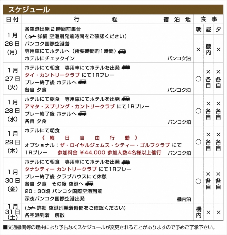 ■ ツアー代金に含まれるもの:上記行程表の空港からホテル・ゴルフ場の送迎、往復航空券代、ホテル:4泊、行程表のゴルフプレー代(グリーンフィー、キャディー、カート代)。