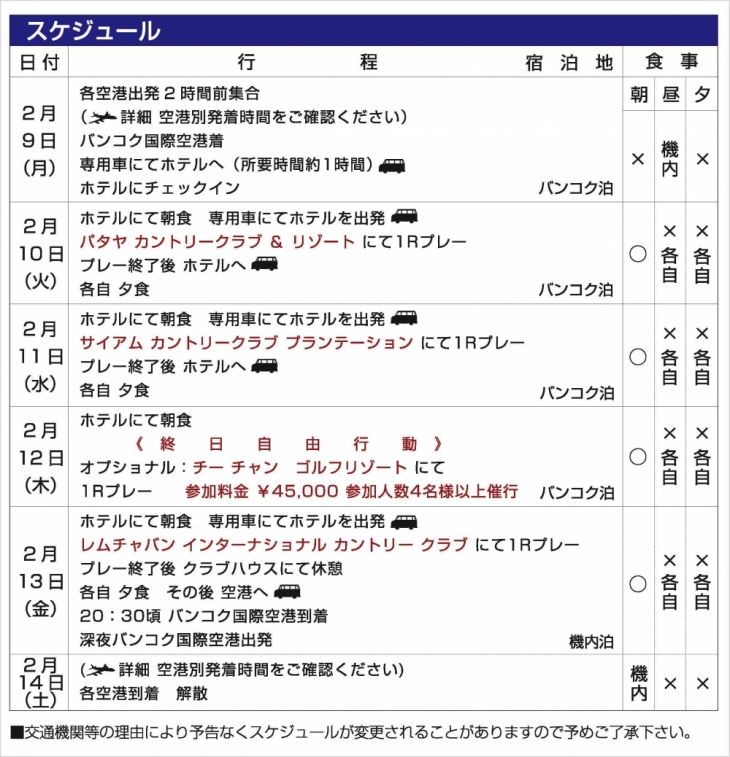 ■ ツアー代金に含まれるもの:上記行程表の空港からホテル・ゴルフ場の送迎、往復航空券代、ホテル:4泊、行程表のゴルフプレー代(グリーンフィー、キャディー、カート代)。
